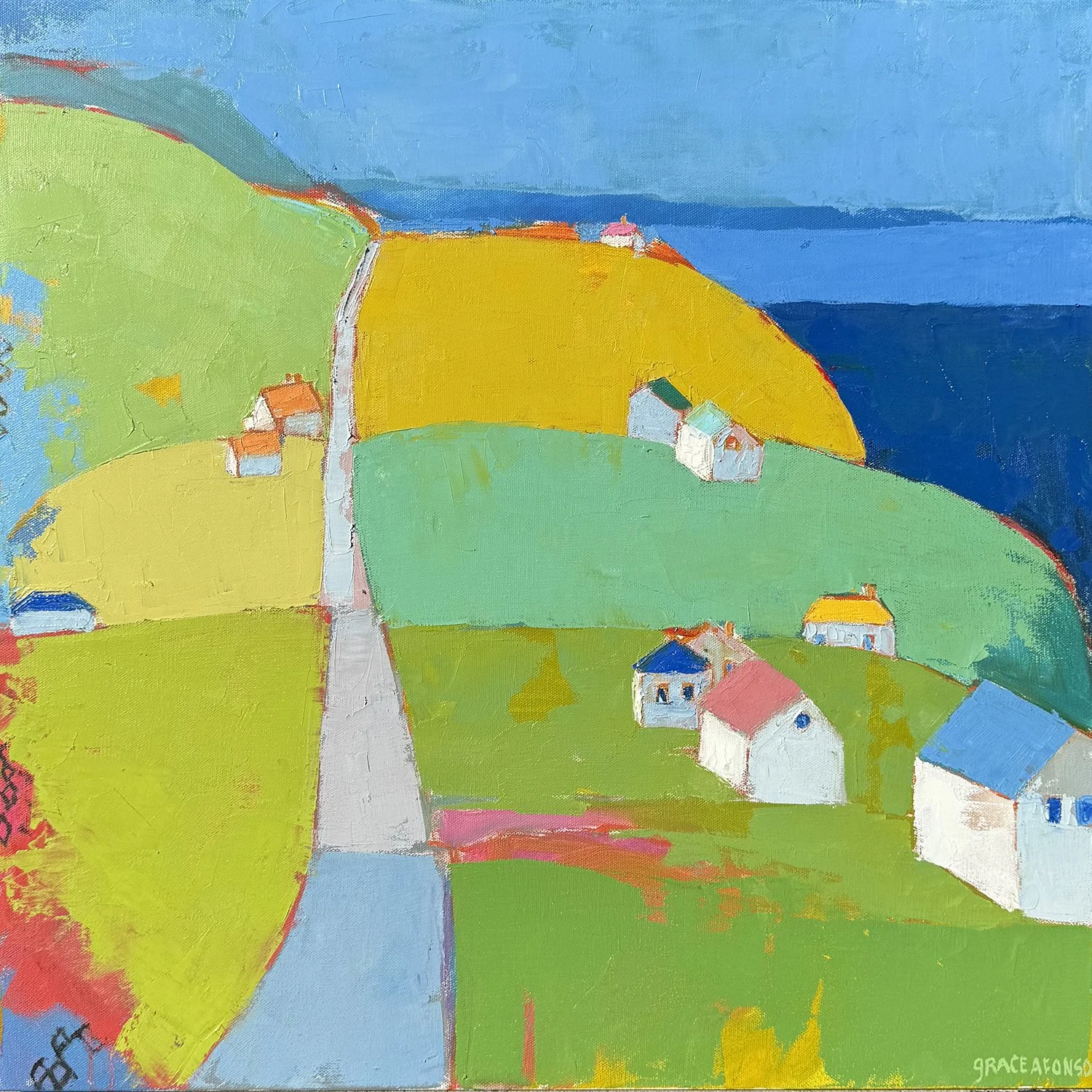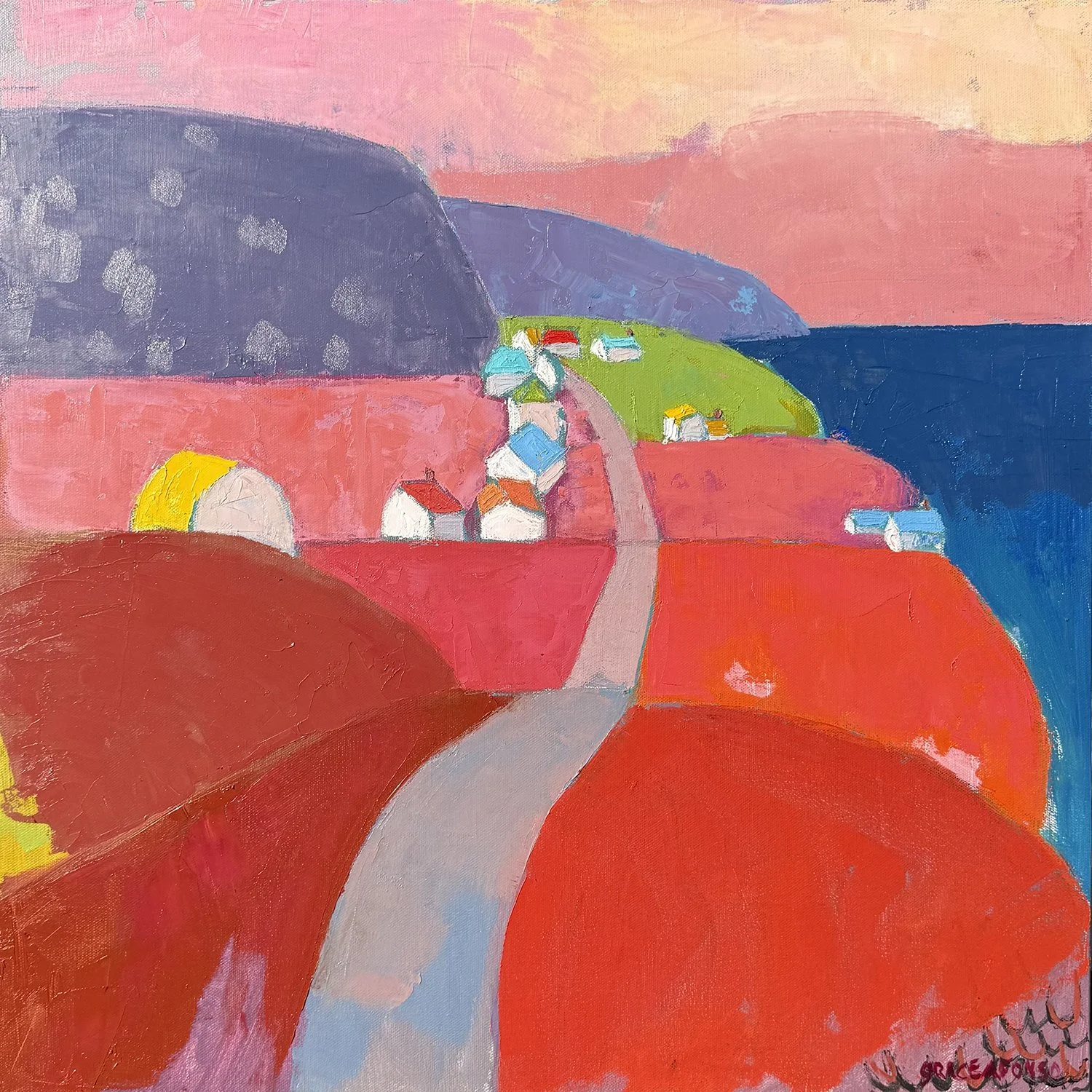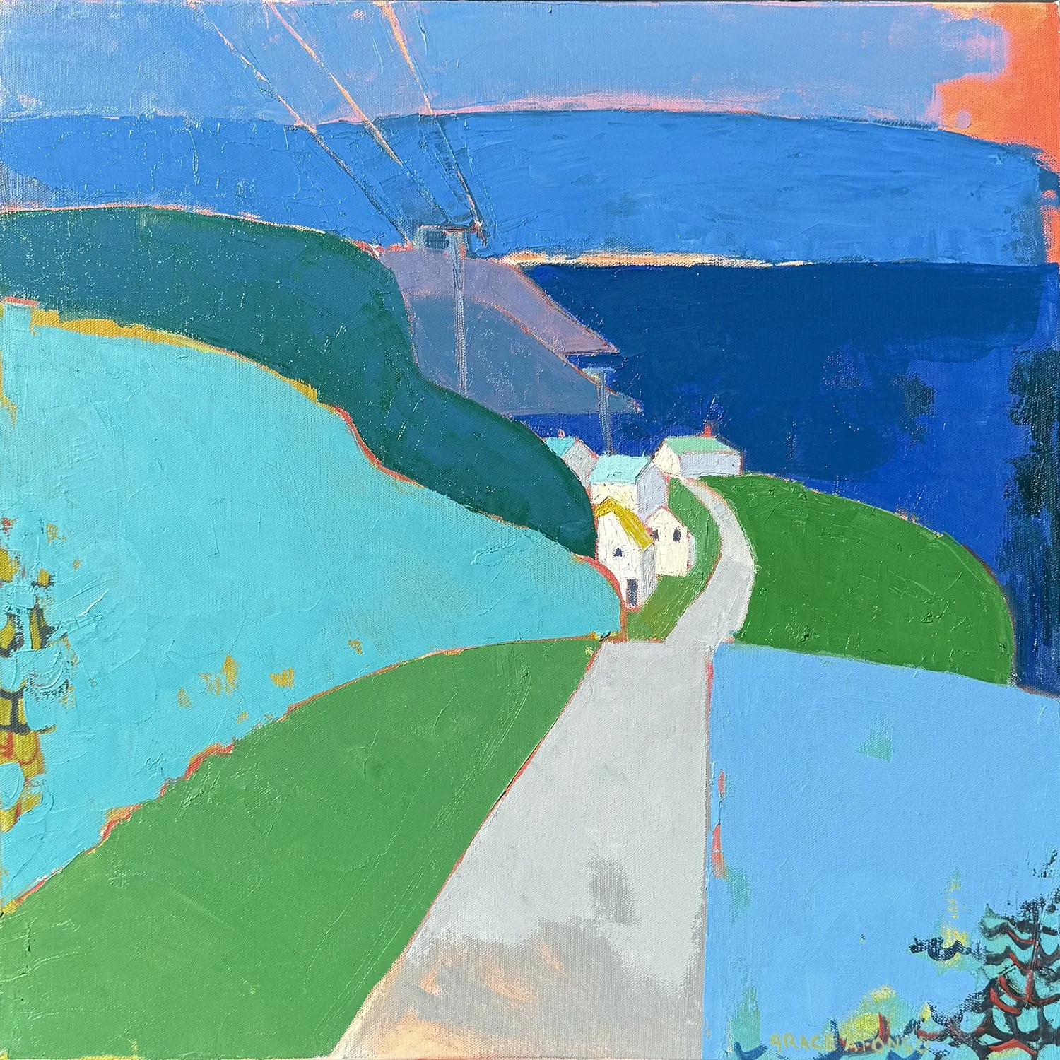 The subject matter of Graces’s work is the celebration of color shown in the exploration of the domestic scene and landscape. It is colours power to effect mood that works as the driving principle behind Grace’s translation of her life to the canvas. She is drawn to representing the home where people gather, and the indoor and outdoor spaces they live in.