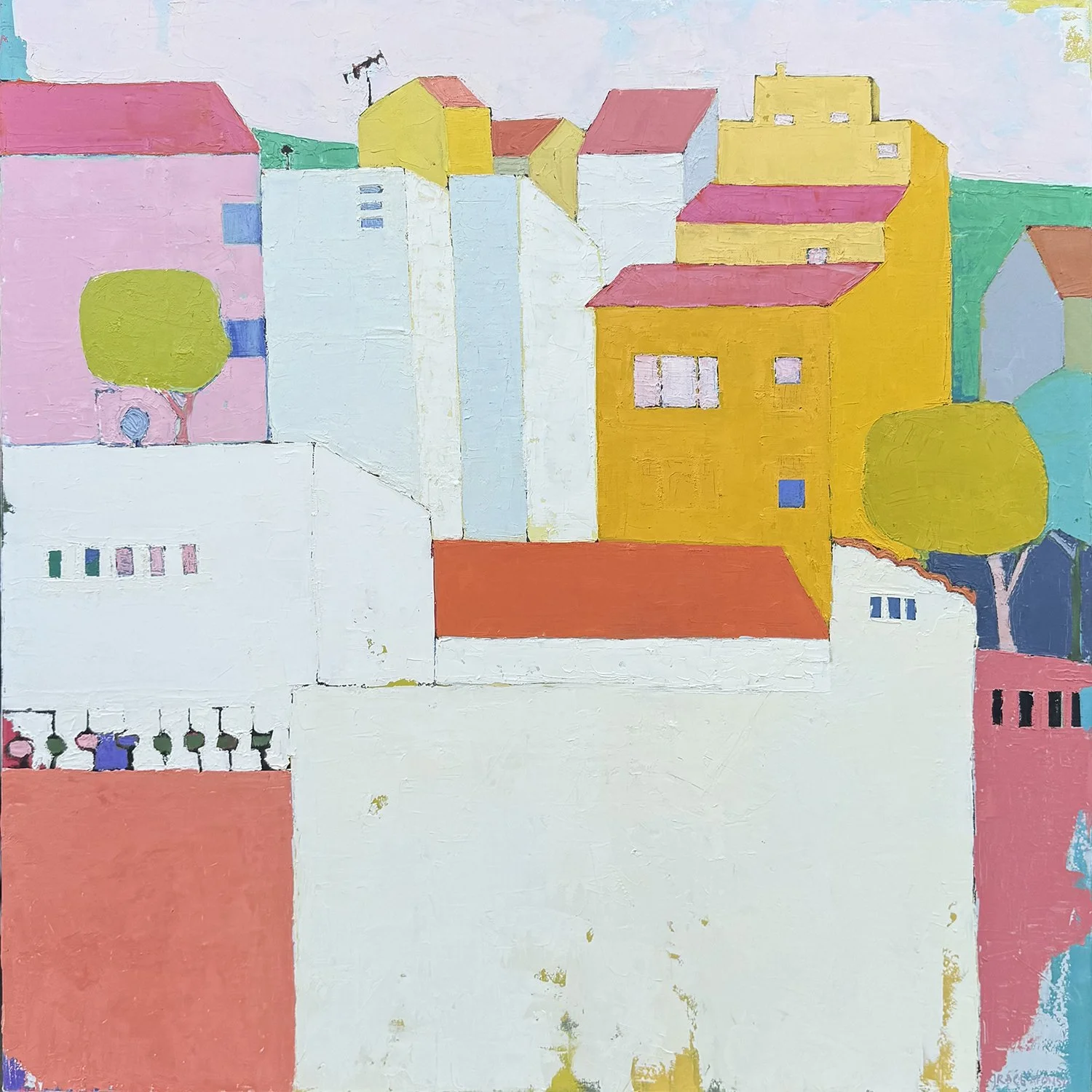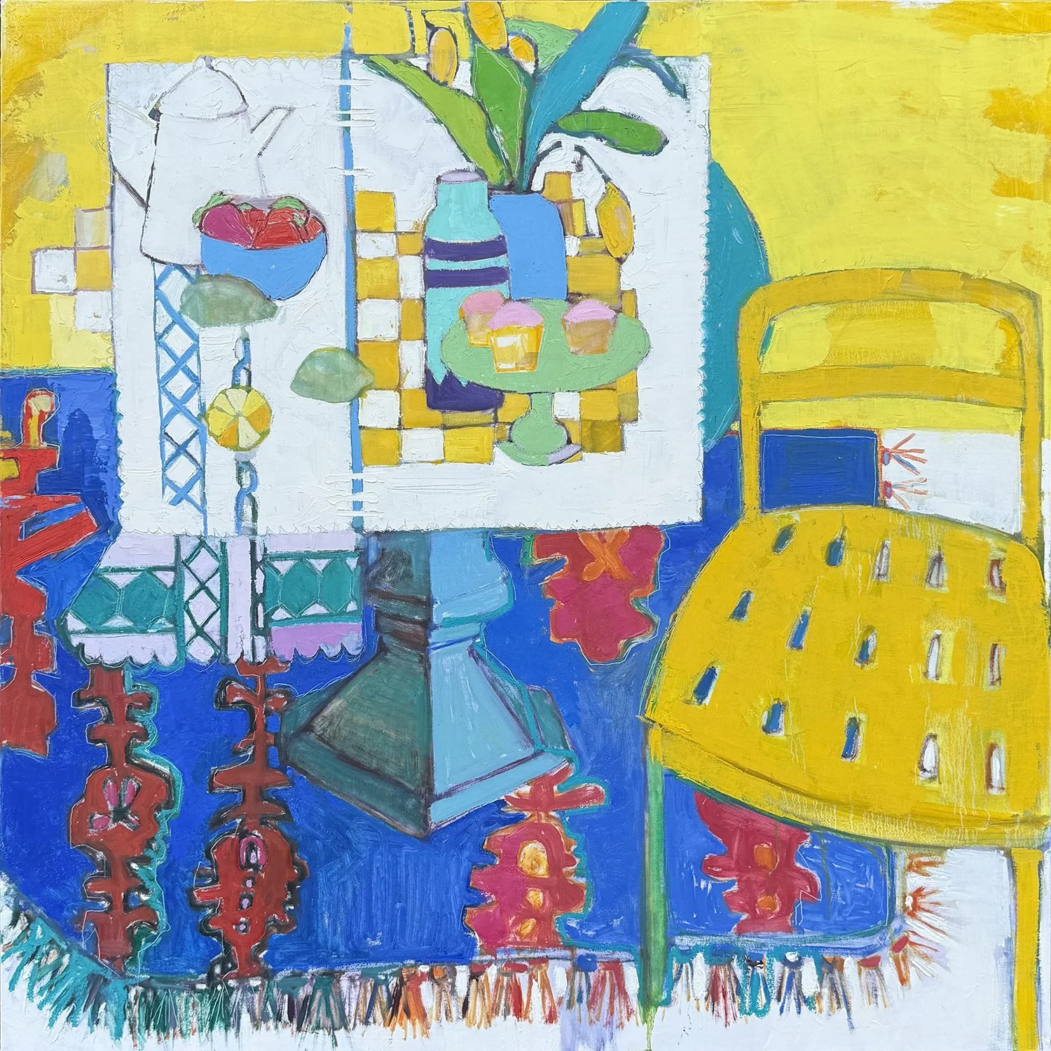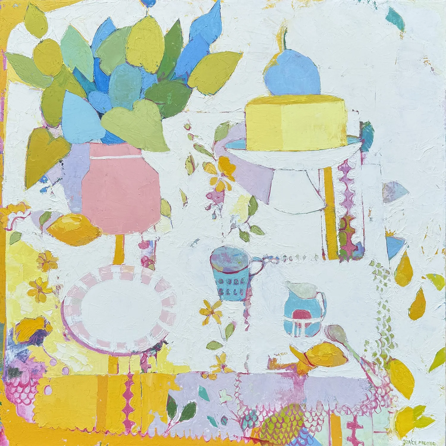 The subject matter of Graces’s work is the celebration of color shown in the exploration of the domestic scene and landscape. It is colours power to effect mood that works as the driving principle behind Grace’s translation of her life to the canvas. She is drawn to representing the home where people gather, and the indoor and outdoor spaces they live in.