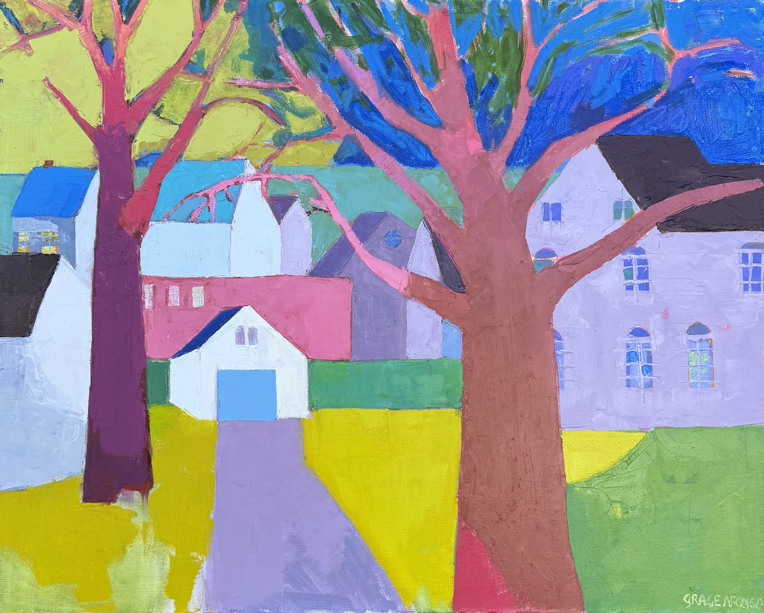 The subject matter of Graces’s work is the celebration of color shown in the exploration of the domestic scene and landscape. It is colour’s power to affect mood that works as the driving principle behind Grace’s translation of her life to the canvas. She is drawn to representing the home where people gather, and the indoor and outdoor spaces they live in.