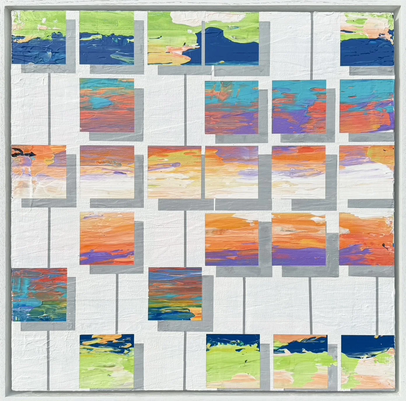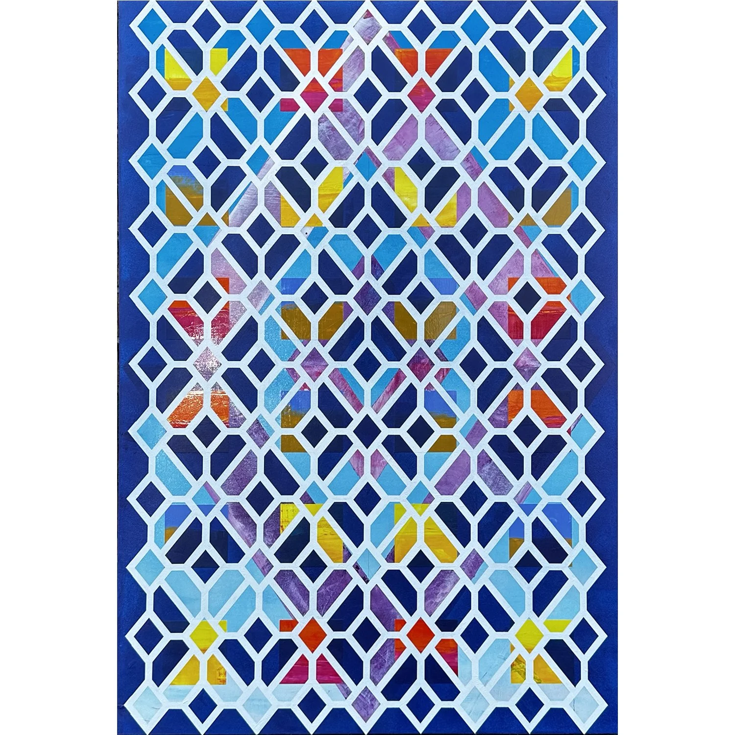 Tom’s varied professional experience and education, have definitively influenced his approach to art. Tom has always been interested in abstraction and geometry, as well as the improvisational application of paint. Living on Mississippi Lake, his passion for water and reflections, have inspired the vivid colour palette and patterns in his work.