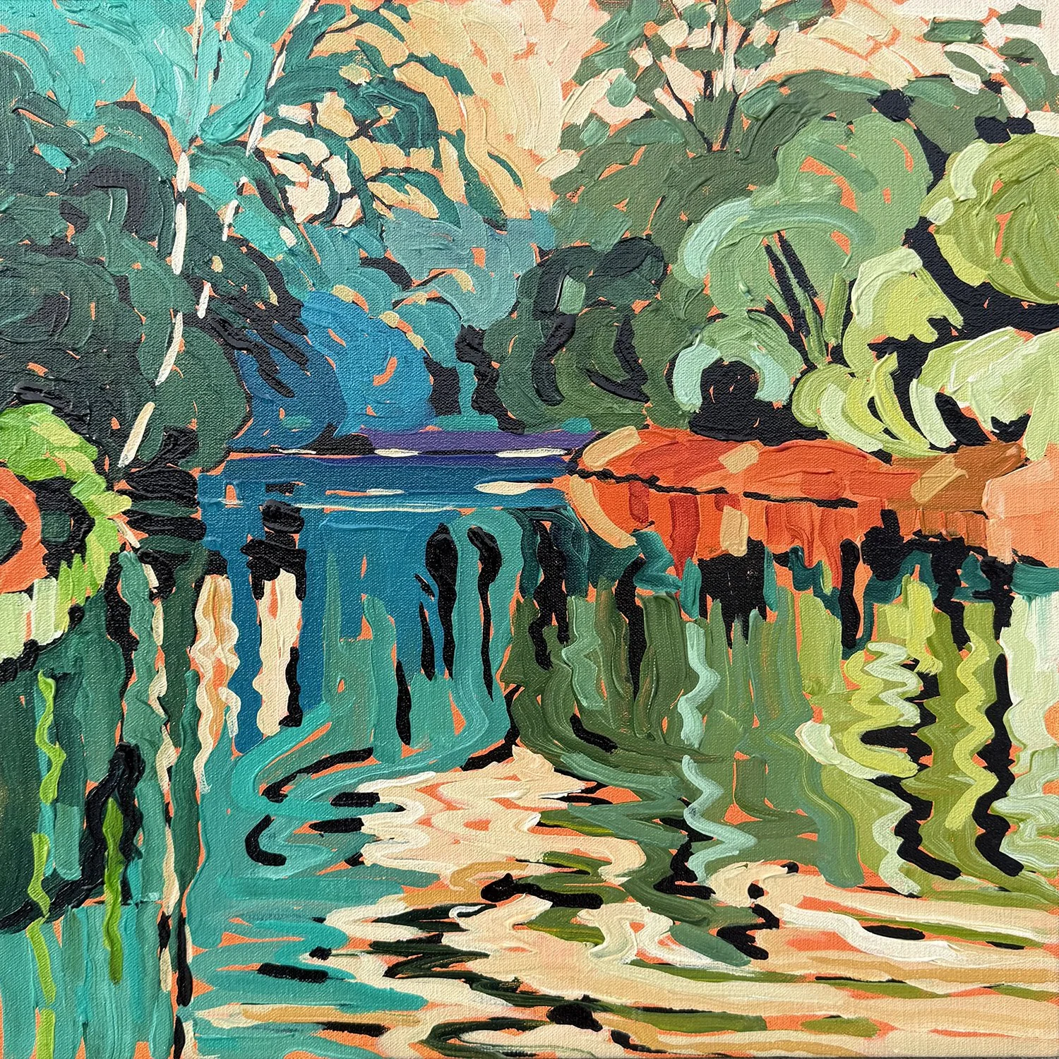 Tracy Bultje is a contemporary Canadian painter based in Chatham, Ontario, whose work draws inspiration from the rural landscapes, waterways, and marshlands of her surroundings. Rather than directly depicting the landscape, Bultje explores the impression of nature’s wildness through bold patterns inspired by botanical and geological forms. Her vibrant, expressive paintings convey a personal and sincere response to the rhythms and energy of the natural world.