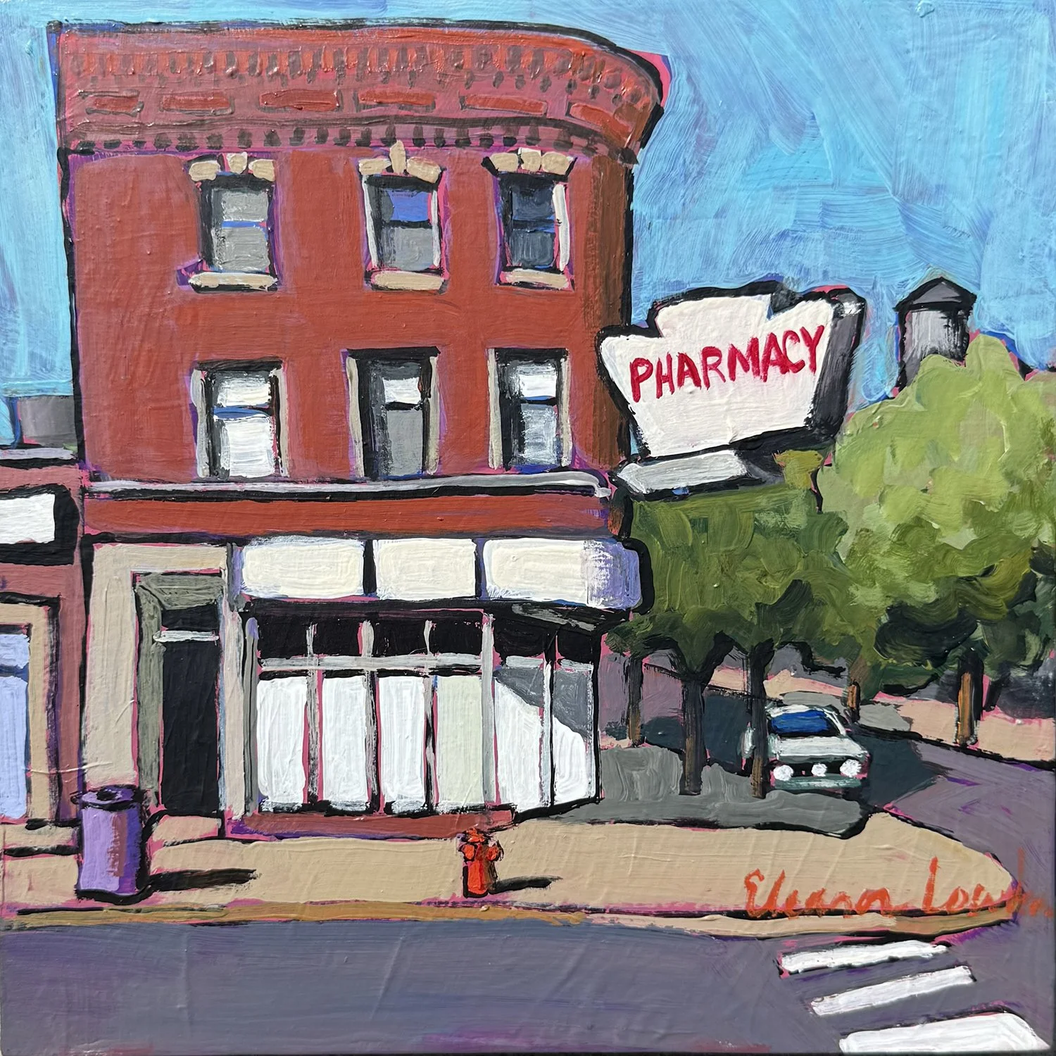 227-167 | Eleanor Lowden, Pharmacy, acrylic on panel, 8”x8”.