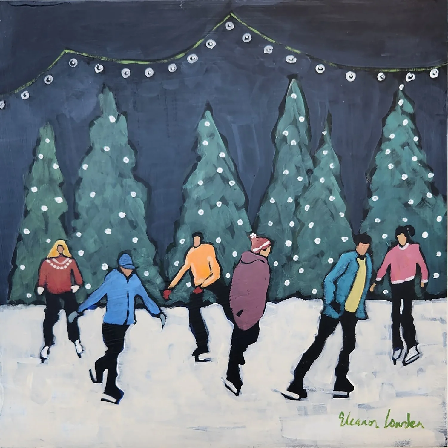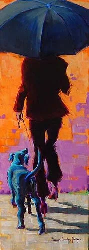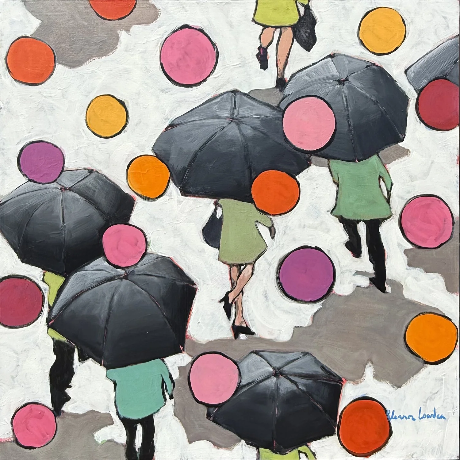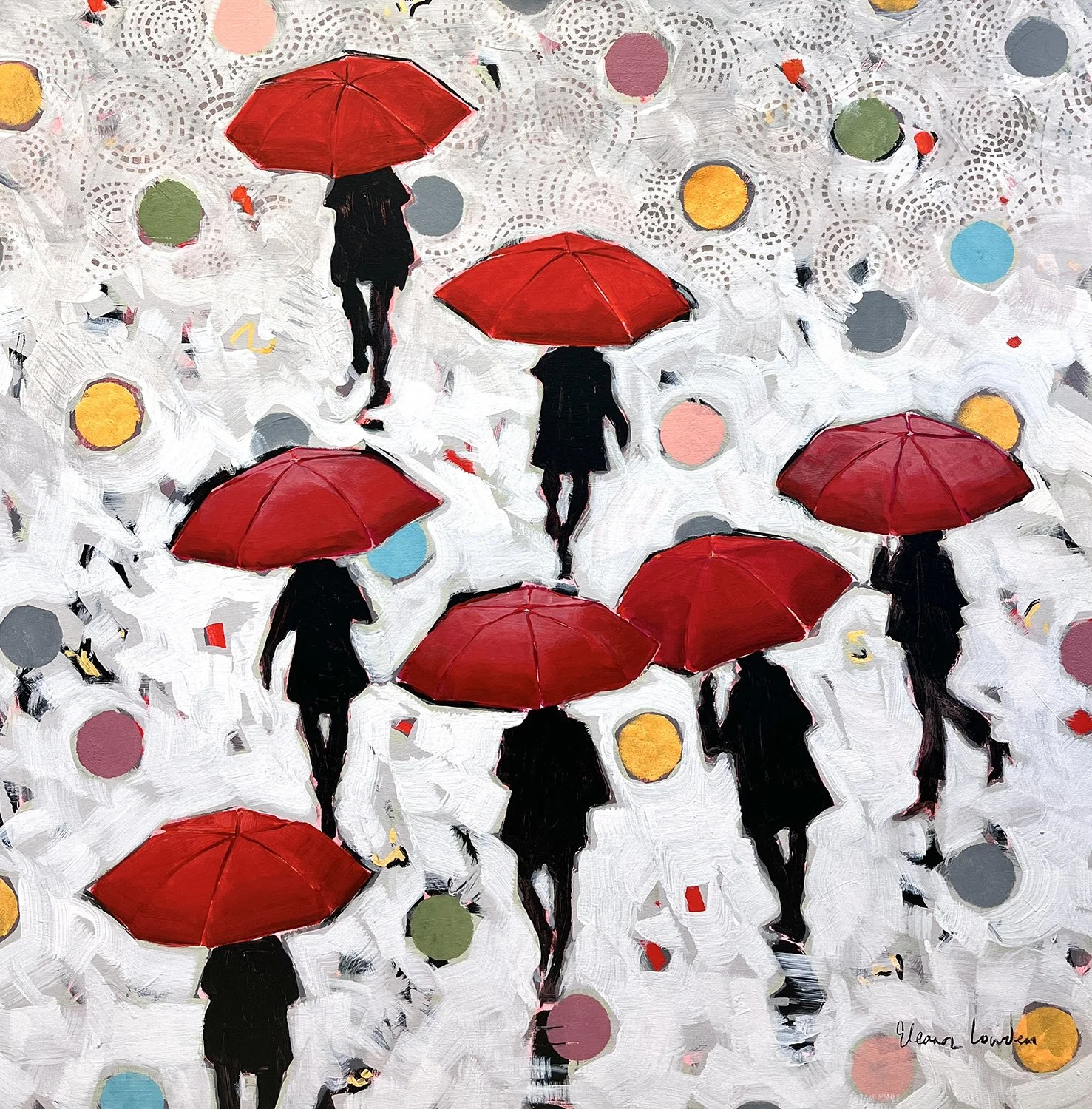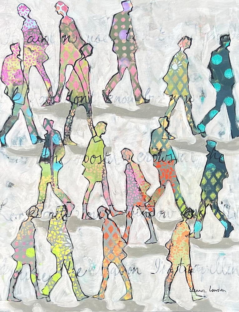 Eleanor Lowden is both fascinated and inspired by people. "My paintings would herald the day, and honour those simple moments that we all take for granted. Walking the dog, shopping, eating, holding hands, talking on the phone, texting. I love to watch crowds of people traveling in different directions, each with their own story and body language, lost in their own thoughts, being in close proximity to people and never connecting. Or perhaps connecting, and that I find equally fascinating and inspiring." These figures provide Eleanor with an endless source of inspiration. Her work is impressionistic, vibrant and loose "I paint with many layers of transparent colour, layering my colors so that they glow. I want the viewer to spend time contemplating both the painting process and the story that I am telling".