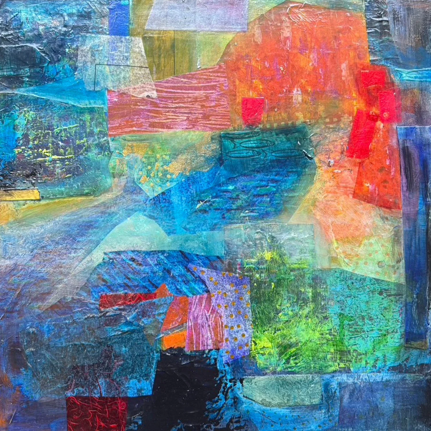 396-254 | Jacquelyn Sloane Siklos, Sunfall Over the Pond, mixed media on canvas, 14”x14”. SOLD